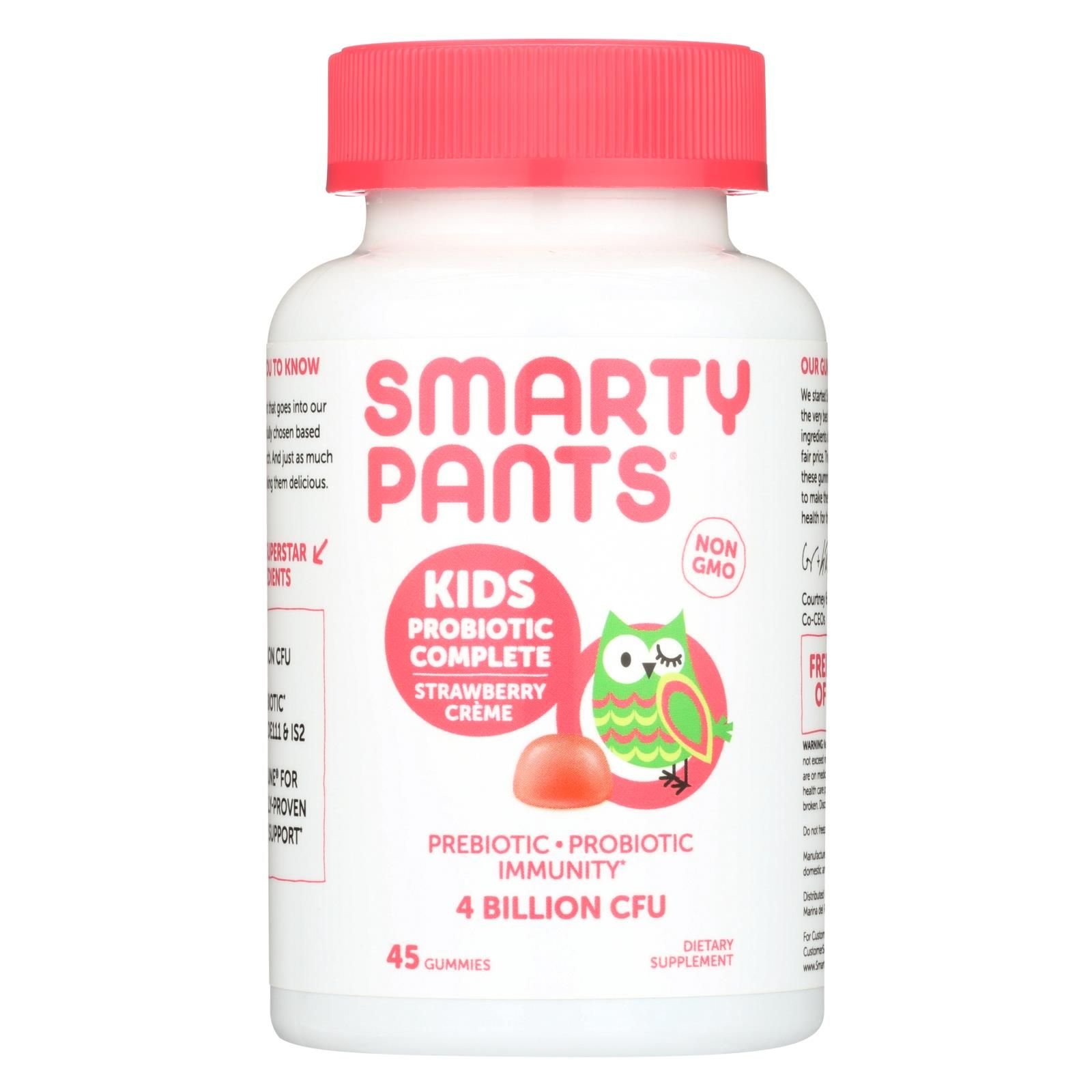 Smarty pants strawberry creme kids probiotic complete dietary supplement offers a vegan option packed with probiotics and prebiotics to support immunity. Designed just for kids, this supplement comes in a gummy chewable form with a tempting strawberry flavor, and it's free of chemicals including artificial flavors, preservatives and colors. Families with food allergies appreciate a formula free of wheat, milk, eggs, fish and shellfish. Each bottle contains 45 kid-friendly gummy supplements.