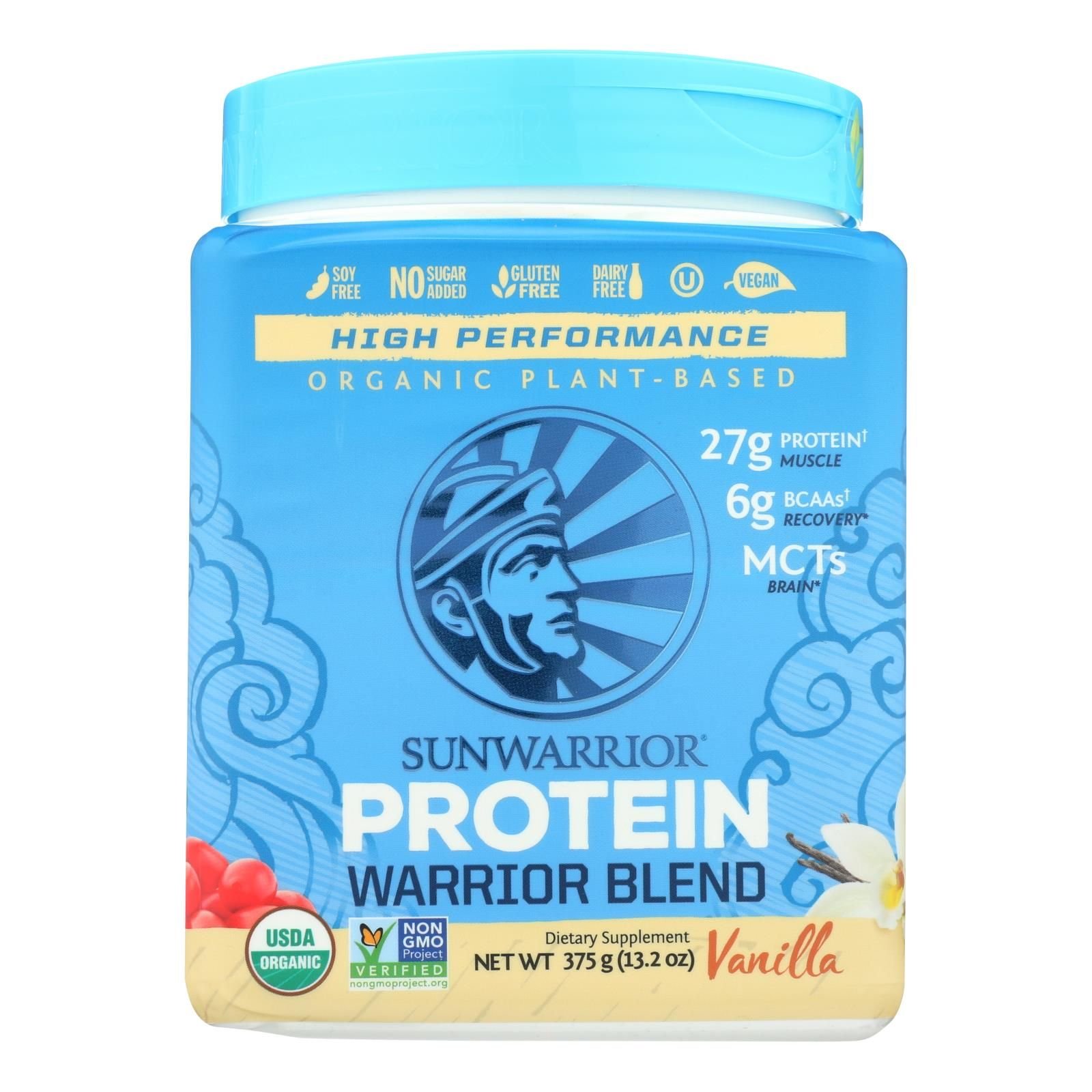 Sunwarrior warrior vanilla blend pea, hemp seed & goji berry blended protein is a usda-certified organic dietary supplement. This vegan blended protein comes in 1 bpa-free, recyclable 375 g. Container and is verified non-gmo. It has no sugar added and contains amino acids. It does not contain synthetic or artificial ingredients.