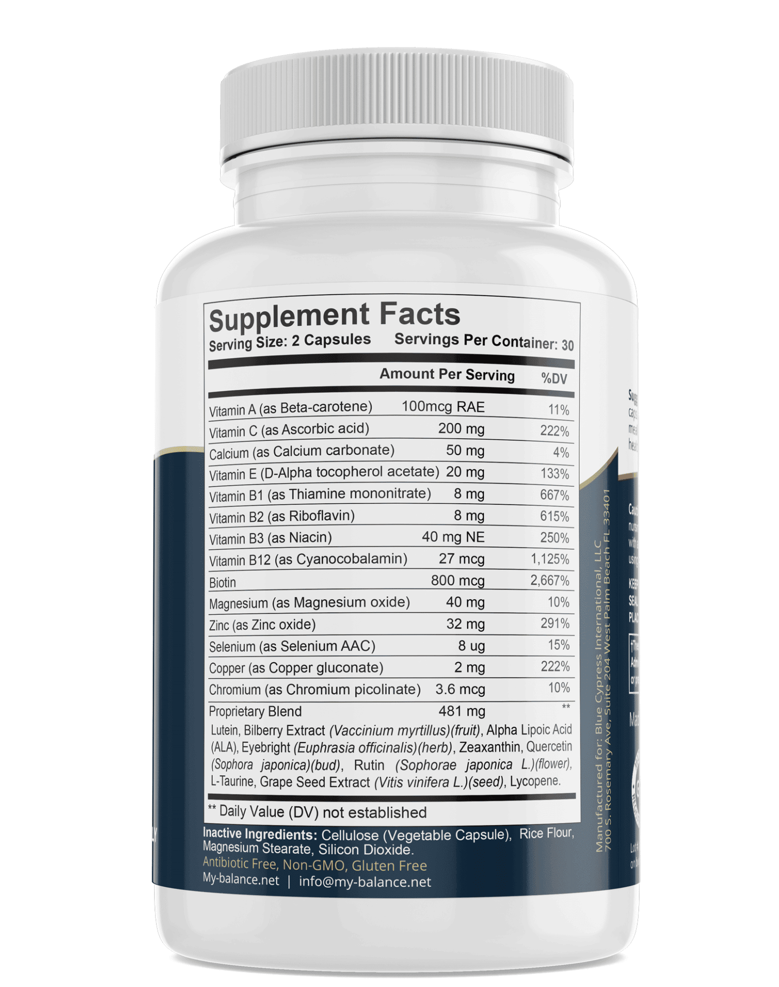My Balance's Vision Care combines these ingredients in a well-balanced formula to offer support for eye health. The supplement's unique blend of lutein, zeaxanthin, bilberry extract, alpha-lipoic acid, eyebright, quercetin, rutin, L-taurine, grape seed extract, lycopene, and essential vitamins and minerals is designed to provide comprehensive support for ocular health.